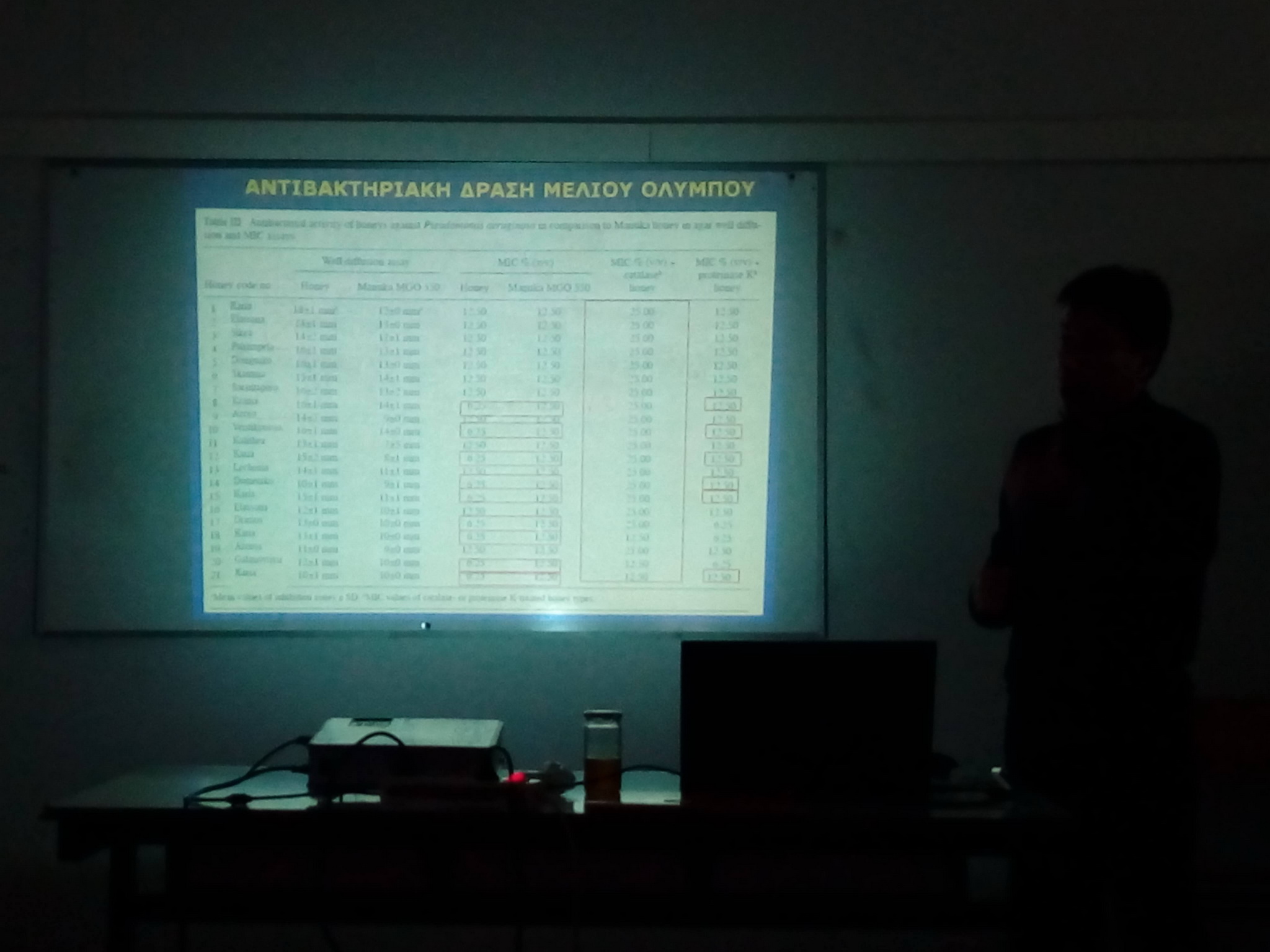 Στα πλαίσια κατάρτισης της ειδικότητας "Τεχνικός Μελισσοκομίας" του 1ου Δ.Ι.Ε.Κ. Λάρισας, ο καθηγητής του Πανεπιστημίου Θεσσαλίας κ. Δημήτρης Στάγκος, ανέλυσε στους καταρτιζόμενους μελισσοκόμους, τα αποτελέσματα μακρόχρονης έρευνας πάνω στην αντιμικροβιακή και αντιοξειδωτική δράση μελιών από την περιοχή του Ολύμπου.